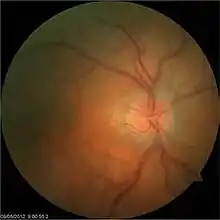 | Fundus photograph of the right eye showing mild vitritis with increase in vascular tortuosity | |