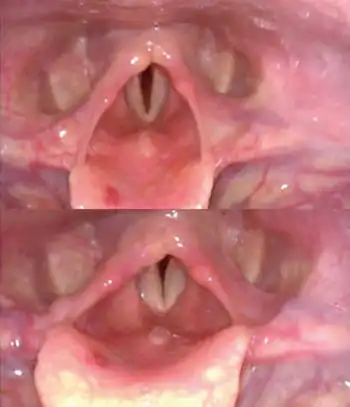 - ↑ Rosen CA, Mau T, Remacle M, Hess M, Eckel HE, Young VN, Hantzakos A, Yung KC, Dikkers FG (August 2016). "Nomenclature proposal to describe vocal fold motion impairment". European Archives of Oto-rhino-laryngology. 273 (8): 1995–9. doi:10.1007/s00405-015-3663-0. PMC 4930794. PMID 26036851.