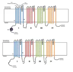 - ↑ Catterall WA (2010). "Ion channel voltage sensors: structure, function, and pathophysiology". Neuron. 67 (6): 915–28. doi:10.1016/j.neuron.2010.08.021. PMC 2950829. PMID 20869590.