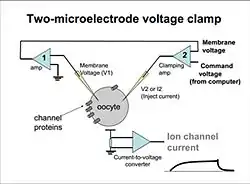 - ↑ Guan B, Chen X, Zhang H (2013). "Two-electrode voltage clamp". Ion Channels. Methods in Molecular Biology. Vol. 998. pp. 79–89. doi:10.1007/978-1-62703-351-0_6. ISBN 978-1-62703-350-3. PMID 23529422.