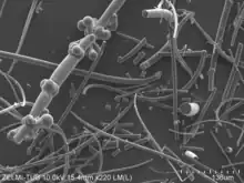 The samples of Volyn biota were found in samples from miarolitic pegmatites ("chamber pegmatites") collected from the Korosten Pluton of the Ukrainian Shield. They were described as early as in 1987, but interpreted as abiogenic formations.[2] In 2000, these formations were reinterpreted as the fossilized cyanobacteria from geyser-type deposits.[3] Until very recently the origin of the Korosten pegmatites was not fully understood, but they were dated to 1.8-1.7 Ga.[4]