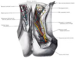 The ilioinguinal nerve originates from the first lumbar nerve and gives branches that include the anterior labial nerves, which supply the skin of the mons pubis and the labia majora.[24] The perineal nerve is one of the terminal branches of the pudendal nerve and this branches into the posterior labial nerves to supply the labia.[24] The pudendal nerve branches include the dorsal nerve, which gives sensation to the clitoris.[24] The clitoral glans is seen to be populated by a large number of small nerves, a number that decreases as the tissue changes towards the urethra.[25] The density of nerves at the glans indicates that it is the center of heightened sensation.[25] Cavernous nerves from the uterovaginal plexus supply the erectile tissue of the clitoris.[26] These are joined underneath the pubic arch by the dorsal nerve of the clitoris.[27] The pudendal nerve enters the pelvis through the lesser sciatic foramen and continues medial to the internal pudendal artery. The point where the nerve circles the ischial spine is the location where a pudendal block of local anesthetic can be administered to inhibit sensation to the vulva.[28] A number of smaller nerves split off from the pudendal nerve. The deep branch of the perineal nerve supplies the muscles of the perineum and a branch of this supplies the bulb of the vestibule.[29][30]