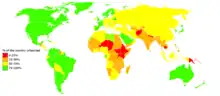 Approximately 40% of the world's population live without basic hand washing facilities with soap and water at home.[56] According to the World Health Organization, over half of the people who live in rural areas in less developed parts of the world do not practice hand washing methods due to a severe lack of water and soap. Improving access to hand washing and sanitation facilities in healthcare settings will significantly reduce infection and mortality rates, particularly in maternal and child health.[57]