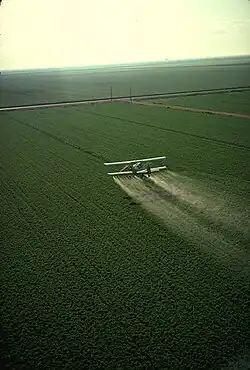 Resistance to a pesticide was first seen in the 1920s with inorganic pesticides,[14] and later it was found that development of resistance is to be expected, and measures to delay it are important. Integrated pest management (IPM) was introduced in the 1950s. By careful analysis and spraying only when an economical or biological threshold of crop damage is reached, pesticide application is reduced. This became in the 2020s the official policy of international organisations, industry, and many governments.[15] With the introduction of high yielding varieties in the 1960s in the green revolution, more pesticides were used.[15] Since the 1980s genetically modified crops were introduced, which resulted in lower amounts of insecticides used on them.[15] Organic agriculture, which uses only non-synthetic pesticides, has grown and in 2020 represents about 1.5 per cent of the world's total agricultural land.[15]