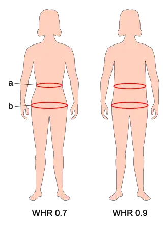 Waist–hip ratio is the ratio of the circumference of the waist to that of the hips. It measures the proportion by which fat is distributed around the torso.[7]