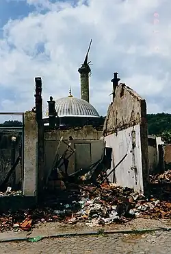 Numerous Albanian cultural sites in Kosovo were destroyed during the Kosovo conflict (1998–1999) which constituted a war crime violating the Hague and Geneva Conventions.[52] Religious objects were also damaged or destroyed. Of the 498 mosques in Kosovo that were in active use, the International Criminal Tribunal for the former Yugoslavia (ICTY) documented that 225 mosques sustained damage or destruction by the Yugoslav Serb army.[53] In all, eighteen months of the Yugoslav Serb counterinsurgency campaign between 1998 and 1999 within Kosovo resulted in 225 or a third out of a total of 600 mosques being damaged, vandalised, or destroyed alongside other Islamic architecture during the conflict.[54][55][53] Other Islamic monuments were also targeted, two Sufi shrines/lodges dating from the 15-18th century were destroyed, A 15th century hamam and all nine quran reading schools were also destroyed.[56] Additionally 500 Albanian owned kulla dwellings (traditional stone tower houses) and three out of four well preserved Ottoman period urban centres located in Kosovo cities were badly damaged resulting in great loss of traditional architecture.[57][54] Kosovo's public libraries, in particular 65 out of 183 were completely destroyed with a loss of 900,588 volumes, while Islamic libraries sustained damage or destruction resulting in the loss of rare books, manuscripts and other collections of literature.[58][59] Archives belonging to the Islamic Community of Kosovo with records spanning 500 years were also destroyed.[58][59] During the war, Islamic architectural heritage posed for Yugoslav Serb paramilitary and military forces as Albanian patrimony with destruction of non-Serbian architectural heritage being a methodical and planned component of ethnic cleansing in Kosovo.[54][60]