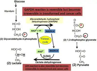 - ↑ Pedersen PL (June 2007). "Warburg, me and Hexokinase 2: Multiple discoveries of key molecular events underlying one of cancers' most common phenotypes, the "Warburg Effect", i.e., elevated glycolysis in the presence of oxygen". Journal of Bioenergetics and Biomembranes. 39 (3): 211–22. doi:10.1007/s10863-007-9094-x. PMID 17879147. S2CID 43490722.
