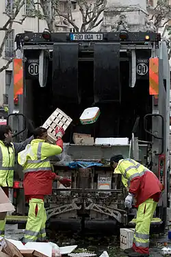 Hazards associated with waste-collection include increased exposure to chemical hazards associated with diesel exhaust, heavy metals, VOCs, PCBs, and dust; and biological hazards such as microorganisms like bacteria, fungi and spores, viruses, and protozoa; and physical hazards such as sharp objects, broken objects, heavy objects, and machinery.[7][10] Physical hazards include ergonomic hazards such as development of WMSD such as sprains, strains, and tears.[11] The job requires much repetitive lifting and pulling of waste material of varying weight, bending over, and movement in awkward positions.[12] Despite assistance from refuse collection trucks, waste collectors often must haul garbage and recyclables to the truck and most still engage in a degree of lifting waste into the vehicle.[12] Many waste collecting jobs are conducted outside, exposing workers to weather conditions, such as extreme heat or cold, that can pose additional health risks, while also putting waste collectors in close proximity to moving vehicles, which can result in them being hit by cars.[6][13] With a multitude of tangible hazards, waste collectors are at risk for psychosocial hazards as it is a physically taxing job involving long hours, median pay, and not well socially supported.[14]