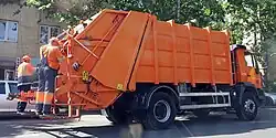 In most countries worldwide, waste collectors operate moving vehicles to aid in gathering garbage. There are several types of waste-collecting vehicles: front-load trucks, rear-load trucks, side-load trucks, and roll-on-off trucks.[5] Waste collecting trucks can be automatic or semi-automatic, lessening the ergonomic challenges for workers. Lifting and loading waste bins remains the main ergonomic stressor associated with the waste-collecting occupation. Collectors are at risk of developing work-related musculoskeletal disorders (WMSD).[6] Risk for injury includes a risk of falling off the truck while it is moving, being run-over by passing motor vehicles, being run over when a waste-collecting truck is reversing, slipping and falling off the refuse vehicle, and losing or otherwise injuring limbs due to getting caught in equipment.[7][8] Waste-collecting vehicles can expose workers to higher amounts of exhaust as many have exhaust pipes located on the back of the vehicle.[7]