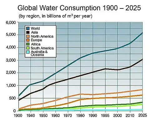 Around fifty years ago, the common view was that water was an infinite resource. At that time, there were fewer than half the current number of people on the planet. People were not as wealthy as today, consumed fewer calories and ate less meat, so less water was needed to produce their food. They required a third of the volume of water we presently take from rivers. Today, the competition for water resources is much more intense. This is because there are now seven billion people on the planet and their consumption of water-thirsty meat is rising. And industry, urbanization, biofuel crops, and water reliant food items are competing more and more for water. In the future, even more water will be needed to produce food because the Earth's population is forecast to rise to 9 billion by 2050.[64]