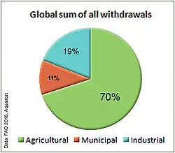 Until recently, groundwater was not a highly used resource. In the 1960s, more and more groundwater aquifers developed.[72] Improved knowledge, technology and funding have made it possible to focus more on drawing water from groundwater resources instead of surface water. These made the agricultural groundwater revolution possible. They expanded the irrigation sector which made it possible to increase food production and development in rural areas.[73] Groundwater supplies nearly half of all drinking water in the world.[74] The large volumes of water stored underground in most aquifers have a considerable buffer capacity. This makes it possible to withdraw water during periods of drought or little rainfall.[32] This is crucial for people that live in regions that cannot depend on precipitation or surface water for their only supplies. It provides reliable access to water all year round. As of 2010, the world's aggregated groundwater abstraction is estimated at 1,000 km3 per year. Of this 67% goes on irrigation, 22% on domestic purposes and 11% on industrial purposes.[32] The top ten major consumers of abstracted water make up 72% of all abstracted water use worldwide. They are India, China, United States of America, Pakistan, Iran, Bangladesh, Mexico, Saudi Arabia, Indonesia, and Italy.[32]