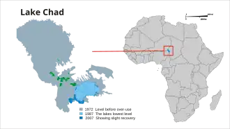 Through the last hundred years, more than half of the Earth's wetlands have been destroyed and have disappeared.[9] These wetlands are important as the habitats of numerous creatures such as mammals, birds, fish, amphibians, and invertebrates. They also support the growing of rice and other food crops. And they provide water filtration and protection from storms and flooding. Freshwater lakes such as the Aral Sea in central Asia have also suffered. It was once the fourth largest freshwater lake in the world. But it has lost more than 58,000 square km of area and vastly increased in salt concentration over the span of three decades.[9]