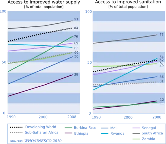 In sub-Saharan Africa access to water supply and sanitation has improved, but the region lags behind all other developing regions: access to safe drinking water had increased from 49% in 1990 to 60% in 2008, while in the same time span access to improved sanitation had only risen from 28% to 31%. Sub-Saharan Africa did not meet the Millennium Development Goals of halving the share of the population without access to safe drinking water and sanitation between 1990 and 2015.[3]