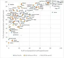 In 2020, 65% of the global population were using piped water (83% urban and 42% rural).[19] Piped water counts as an improved water source.[20]: 12 Overall, sub-Saharan Africa is lagging, with 35% of the population using piped water (56% urban and 20% rural). Within these statistics, access to safely managed drinking water varies within and between large cities, medium- and small-towns.[19]