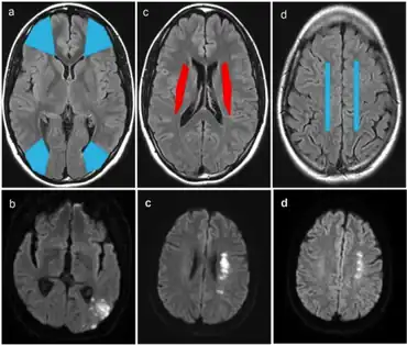 - ↑ 3.0 3.1 3.2 3.3 3.4 3.5 3.6 3.7 3.8 Momjian-Mayor, I; Baron, J.C. (2005). "The Pathophysiology of Watershed Infarction in Internal Carotid Artery Disease: Review of Cerebral Perfusion Studies". Stroke. 36 (3): 567–77. doi:10.1161/01.STR.0000155727.82242.e1. PMID 15692123.