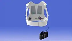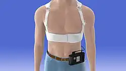 The WCD is a non-invasive medical device. It consists of a fabric garment, electrodes located in the fabric garment for sensing and delivering an electrical shock, and a battery-powered device that monitors the patient and connects to the electrodes and defibrillation pads. The WCD is worn under the clothing during the entire day. The WCD should only be removed when taking a shower or bath. The electrodes lie directly on the skin. The monitoring device constantly records heart rate and rhythm.[3] If life-threatening cardiac arrhythmias, such as ventricular tachycardia (VT) or ventricular fibrillation (VF) are detected, the defibrillator delivers one or more treatment shock(s) in order to restore a normal heart rhythm. Since the time between a cardiac arrest and defibrillation is directly linked to survival,[4][5] a treatment shock must be delivered within a few minutes after an event to be effective. With every passing minute without treatment, the chances of patient survival is reduced by 7-10%.[6][7] From detecting a life-threatening cardiac arrhythmia to automatically delivering a treatment shock, the WCD usually needs less than a minute. The first treatment shock success rate for resuscitating patients from SCD is 98%.[8] Intervention from bystanders or emergency personnel is not required for the WCD to work.