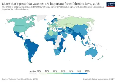 In June 2019, Wellcome released the results of the 2018 global survey on public attitudes toward science and health. Topics include trust of scientists, doctors, and nurses; religion and science, and vaccines, among others.[29] It was Wellcome's first Global Monitor and was intended to "provide robust evidence on how public attitudes vary across different demographic groups and countries."[30]