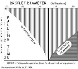 The Wells curve (or Wells evaporation falling curve of droplets) is a diagram, developed by W. F. Wells in 1934, which describes what is expected to happen to small droplets once they have been exhaled into air.[1] Coughing, sneezing, and other violent exhalations produce high numbers of respiratory droplets derived from saliva and/or respiratory mucus, with sizes ranging from about 1 μm to 2 mm.[2][3] Wells' insight was that such droplets would have two distinct fates, depending on their sizes. The interplay of gravity and evaporation means that droplets larger than a humidity-determined threshold size would fall to the ground due to gravity, while droplets smaller than this size would quickly evaporate, leaving a dry residue that drifts in the air. Since droplets from an infected person may contain infectious bacteria or viruses, these processes influence transmission of respiratory diseases.[4][5]