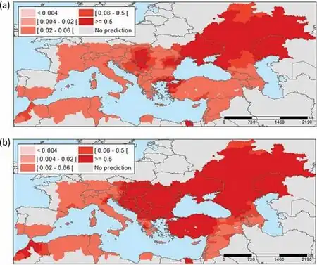 - ↑ 57.0 57.1 Paz, Shlomit (2015-04-05). "Climate change impacts on West Nile virus transmission in a global context". Philosophical Transactions of the Royal Society B: Biological Sciences. 370 (1665): 20130561. doi:10.1098/rstb.2013.0561. ISSN 0962-8436. PMC 4342965. PMID 25688020.
