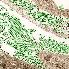 In September 2014, the WHO had reported: "No formal evidence exists of sexual transmission, but sexual transmission from convalescent patients cannot be ruled out. There is evidence that live Ebola virus can be isolated in seminal fluids of convalescent men for 82 days after onset of symptoms. Evidence is not available yet beyond 82 days."[296] In April 2015, following a report that the RNA virus had been detected in a semen sample six months after a man's recovery, the WHO issued a statement: "For greater security and prevention of other sexually transmitted infections, Ebola survivors should consider correct and consistent use of condoms for all sexual acts beyond three months until more information is available."[297][298]