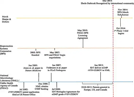 The outbreak left about 17,000 survivors of the disease, many of whom report post-recovery symptoms termed post-Ebola syndrome, often severe enough to require medical care for months or even years. An additional cause for concern is the apparent ability of the virus to "hide" in a recovered survivor's body for an extended period of time and then become active months or years later, either in the same individual or in a sexual partner.[31] In December 2016, the WHO announced that a two-year trial of the rVSV-ZEBOV vaccine appeared to offer protection from the variant of EBOV responsible for the Western Africa outbreak. The vaccine is considered to be effective and is the only prophylactic which offers protection; hence, 300,000 doses have been stockpiled.[32][33] rVSV-ZEBOV received regulatory approval in 2019.[34][35]