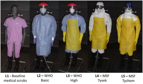 One of the biggest dangers of infection faced by medical staff requires their learning how to properly suit up and remove personal protective equipment. Full training for wearing protective body clothing can take 10 to 14 days.[305] Even with proper isolation equipment available, working conditions such as lack of running water, climate control, and flooring have made direct care difficult. Two American health workers who contracted the disease and later recovered said that to the best of their knowledge, their team of workers had been following "to the letter all of the protocols for safety that were developed by the [CDC] and WHO", including a full body coverall, several layers of gloves, and face protection including goggles. One of the two, a physician, had worked with patients, but the other was assisting workers to get in and out of their protective gear while wearing protective gear herself.[306]