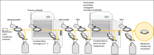 The western blot (sometimes called the protein immunoblot), or western blotting, is a widely used analytical technique in molecular biology and immunogenetics to detect specific proteins in a sample of tissue homogenate or extract.[1]