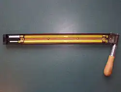 A sling psychrometer. The sock (small piece of white fabric covering the tip of the upper tube shown in the photo) is wet with distilled water and whirled around for a minute or more before taking the readings.