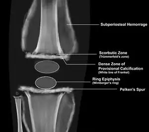 Wimberger's ring sign refers to a circular calcification surrounding the osteoporotic epiphyseal centers of ossification, which may result from bleeding.[1] It is seen in cases of scurvy.[1]