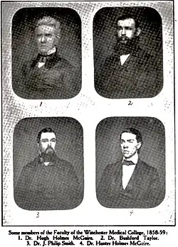 The second most influential man in Winchester was arguably Hugh Holmes McGuire (1801–1875), founder of the Winchester Medical College; he was certainly the most distinguished doctor in northern Virginia. "Although well advanced in years [he was 60], Dr. McGuire was with the cause so heartily that he accepted a commission as surgeon in the Confederate Army, and had charge of the hospitals at Greenwood and Lexington."[20]