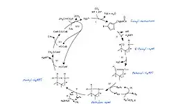The Wolfe Cycle is a methanogenic pathway used by archaea; the archaeon takes H2 and CO2 and cycles them through a various intermediates to create methane.[1] The Wolfe Cycle is modified in different orders and classes of archaea as per the resource availability and requirements for each species, but it retains the same basic pathway.[1] The pathway begins with the reducing carbon dioxide to formylmethanofuran.[1] The last step uses heterodisulfide reductase (Hdr) to reduce heterodisulfide into Coenzyme B and Coenzyme M using Fe4S4 clusters.[1][2] Evidence suggests this last step goes hand-in-hand with the first step, and feeds back into it, creating a cycle.[1] At various points in the Wolfe Cycle, intermediates that are formed are taken out of the cycle to be used in other metabolic processes.[1][3] Since intermediates are being taken out at various points in the cycle, there is also a replenishing (anaplerotic) reaction that feeds into the Wolfe cycle, this is to regenerate necessary intermediates for the cycle to continue.[1] Overall, including the replenishing reaction, the Wolfe Cycle has a total of nine steps.[1] While Obligate reducing methanogens perform additional steps to reduce CO2 to .