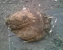 Wolfiporia extensa (syn. Poria cocos F.A.Wolf), commonly known as hoelen, poria, tuckahoe, China root, fu ling (茯苓, pīnyīn: fúlíng), or matsuhodo, is a species of fungus in the family Polyporaceae. It is a wood-decay fungus but has a subterranean growth habit. It notably develops a large, long-lasting underground sclerotium resembling a small coconut.