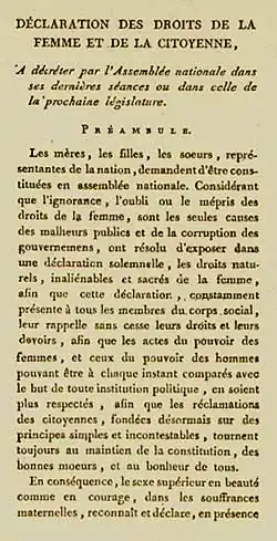 In 1791 the French playwright and political activist Olympe de Gouges published the Declaration of the Rights of Woman and of the Female Citizen,[109] modelled on the Declaration of the Rights of Man and of the Citizen of 1789. The Declaration is ironic in formulation and exposes the failure of the French Revolution, which had been devoted to equality. It states that: "This revolution will only take effect when all women become fully aware of their deplorable condition, and of the rights they have lost in society". The Declaration of the Rights of Woman and the Female Citizen follows the seventeen articles of the Declaration of the Rights of Man and of the Citizen point for point and has been described by Camille Naish as "almost a parody... of the original document". The first article of the Declaration of the Rights of Man and of the Citizen proclaims that "Men are born and remain free and equal in rights. Social distinctions may be based only on common utility." The first article of the Declaration of the Rights of Woman and of the Female Citizen replied: "Woman is born free and remains equal to man in rights. Social distinctions may only be based on common utility". De Gouges expands the sixth article of the Declaration of the Rights of Man and of the Citizen, which declared the rights of citizens to take part in the formation of law, to: