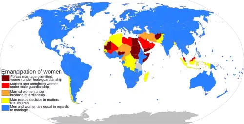 For Arab women, Islam included the prohibition of female infanticide and recognizing women's full personhood.[72] Women generally gained greater rights than women in pre-Islamic Arabia[73][74] and medieval Europe.[75] Women were not accorded such legal status in other cultures until centuries later.[76] According to Professor William Montgomery Watt, when seen in such a historical context, Muhammad "can be seen as a figure who testified on behalf of women's rights."[77]