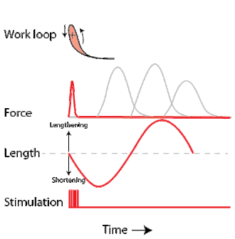 To simulate the rhythmic shortening and lengthening of a muscle (e.g. while moving a limb) and natural kinematics, a servo motor oscillates the muscle at a given frequency and range of motion observed in natural behavior. Simultaneously, a burst of electrical pulses is applied to the muscle at the beginning of each shortening-lengthening cycle to stimulate the muscle to produce force. Since force and length return to their initial values at the end of each cycle, a plot of force vs. length yields a 'work loop'. Intuitively, the area enclosed by the loop represents the net mechanical work performed by the muscle during a single cycle.