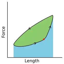 Hypothetically, a square work loop (area = max force x max displacement) would represent the maximum work output of a muscle operating within a given force and length range.[9][11] Conversely, a flat line (area = 0) would represent the minimum work output. For example, a muscle that generates force without changing length (isometric contraction) will show a vertical line 'work loop'. Reciprocally, a muscle that shortens without changing force (isotonic contraction) will show a horizontal line 'work loop'. Finally, a muscle can behave like a spring which extends linearly as a force is applied. This final case would yield a slanted straight line 'work loop' where the line slope is the spring stiffness.[12]