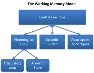 In 1974 Baddeley and Hitch[11] introduced the multicomponent model of working memory. The theory proposed a model containing three components: the central executive, the phonological loop, and the visuospatial sketchpad with the central executive functioning as a control center of sorts, directing info between the phonological and visuospatial components.[12] The central executive is responsible for, among other things, directing attention to relevant information, suppressing irrelevant information and inappropriate actions, and coordinating cognitive processes when more than one task is simultaneously performed. A "central executive" is responsible for supervising the integration of information and for coordinating subordinate systems responsible for the short-term maintenance of information. One subordinate system, the phonological loop (PL), stores phonological information (that is, the sound of language) and prevents its decay by continuously refreshing it in a rehearsal loop. It can, for example, maintain a seven-digit telephone number for as long as one repeats the number to oneself repeatedly.[13] The other subordinate system, the visuospatial sketchpad, stores visual and spatial information. It can be used, for example, for constructing and manipulating visual images and for representing mental maps. The sketchpad can be further broken down into a visual subsystem (dealing with such phenomena as shape, colour, and texture), and a spatial subsystem (dealing with location).