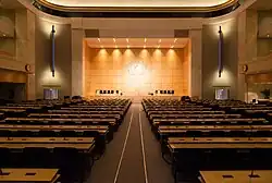 The members of the WHA generally meet every year in May in Geneva, Switzerland, at the Palace of Nations, the location of WHO Headquarters. The main tasks of the WHA are to decide major policy questions, as well as to approve the WHO work programme and budget and elect its Director-General (every fifth year) and annually to elect ten members to renew part of its executive board.[1] Its main functions are to determine the policies of the Organization, supervise financial policies, and review and approve the proposed programme budget.