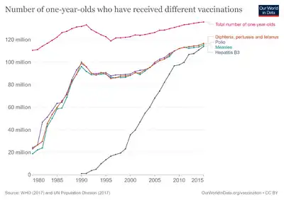 Immunization can protect against 25 different infectious agents or diseases, from infancy to old age, including diphtheria, measles, pertussis, polio, tetanus and COVID-19. The World Health Organization (WHO) estimates active immunization currently averts 2 to 3 million deaths every year. However, 22.6 million infants worldwide are still missing out on basic vaccines, mostly in developing countries.[1] Inadequate immunization coverage rates often result from limited resources, competing health priorities, poor management of health systems and inadequate surveillance. The goal of World Immunization Week is to raise public awareness of how immunization saves lives, and support people everywhere to get the vaccinations needed against deadly diseases for themselves and their children.