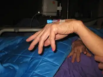 • Neuropathy in the hands and/or arms in patients with rheumatoid arthritis may in rare cases cause wrist drop. "When a joint swells, it can pinch the nerves of sensation that pass next to it. If the swelling irritates the nerve, either because of the inflammation or simply because of pressure, the nerve can send sensations of pain, numbness, and/or tingling to the brain. This is called nerve entrapment. Nerve entrapment most frequently occurs at the wrist (carpal tunnel syndrome) and elbow (ulnar nerve entrapment). A rare form of nerve disease in patients with rheumatoid arthritis that causes numbness and/or tingling is neuropathy. Neuropathy is nerve damage that in people with rheumatoid arthritis can result from inflammation of blood vessels (vasculitis)."[3]