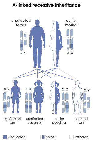 The disorder is inherited in an X-linked recessive fashion (as the gene linked to it is on the X chromosome) and is almost entirely limited to the sons of asymptomatic female carriers.[7] This is because males have only one copy of the X chromosome, while females have two copies; one normal copy of an X chromosome can compensate for mutations in the other X chromosome, so they are less likely to be symptomatic.