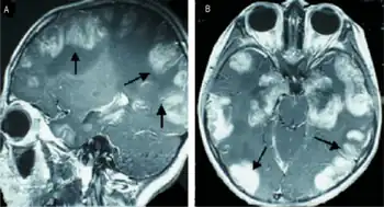 | a,b)MRI scans of the brain show multiple non-homogeneous, hypodense masses along the bilateral cortex | |