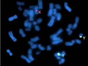 Pubertal development is normal and these men are usually fertile. - ↑ Gardner, R.J. McKinlay; Sutherland, Grant R. (2004). Chromosome abnormalities and genetic counseling (3rd ed.). Oxford: Oxford University Press. pp. 29–30, 42, 199, 207, 257, 263, 393, 424–430. ISBN 978-0-19-514960-9.