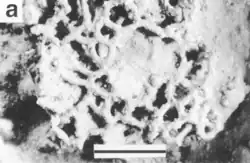 It has been suggested that the mysterious vendozoans of the Ediacaran period represent fossil xenophyophores.[32] However, the discovery of C27 sterols associated with the fossils of Dickinsonia cast doubt on this identification, as these sterols are today associated only with animals. These researchers suggest that Dickinsonia and relatives are instead stem-bilaterians.[33] Other ediacaran fossils, such as Palaeopascichnus Intrites, Yelovichnus, and Neonereites have been posited as fossil xenophyophores and linked to the Eocene fossil Benkovacina. However, analysis of the latter found neither barite crystals nor evidence of agglutinated foraminifera in the wall.[34][35] A 2011 study that examined growth and development of Palaeopascichnus concluded it was likely not a xenophyophore.[16] A 2014 study of Pteridinum reached similar conclusions.[36]