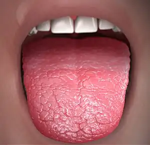 - Fissured tongue with atrophy of the filiform papillae and a lobulated, erythematous appearance of the tongue.[10][5]