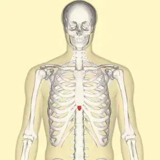 The xiphoid process (/ˈzɪfɔɪd/), also referred to as the ensiform process, xiphisternum, or metasternum, constitutes a small cartilaginous process (extension) located in the inferior segment of the sternum, typically ossified in adult humans.[1] Both the Greek-derived term xiphoid and its Latin equivalent, ensiform, connote a "swordlike" or "sword-shaped" morphology.