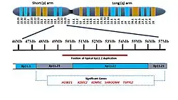 Xp11.22 comprises approximately 5 Mb of DNA (chrX:49,800,001–54,800,000, hg19). A number of pathogenic deletions and duplications involving Xp11.22 have been described in individuals with developmental delay, intellectual disability and/or autism.[9] These phenotypes have been attributed to changes in the copy number of several genes including HUWE1, KDM5C, IQSEC2, TSPYL2, SHROOM4, PHF8 and FAM120C.[10][11]