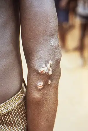 | Nodules on the elbow resulting from a Treponema pallidum pertenue bacterial infection | |