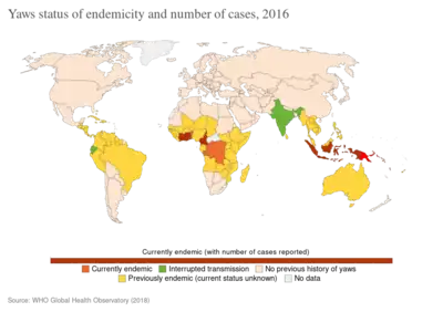 - ↑ 11.0 11.1 "Number of cases of yaws reported". World Health Organization Global Health Observatory. Archived from the original on 18 July 2020. Retrieved 13 February 2019.