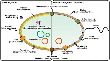 Yersinia is a genus of bacteria in the family Yersiniaceae.[1] Yersinia species are Gram-negative, coccobacilli bacteria, a few micrometers long and fractions of a micrometer in diameter, and are facultative anaerobes.[2] Some members of Yersinia are pathogenic in humans; in particular, Y. pestis is the causative agent of the plague. Rodents are the natural reservoirs of Yersinia; less frequently, other mammals serve as the host. Infection may occur either through blood (in the case of Y. pestis) or in an alimentary fashion, occasionally via consumption of food products (especially vegetables, milk-derived products, and meat) contaminated with infected urine or feces.